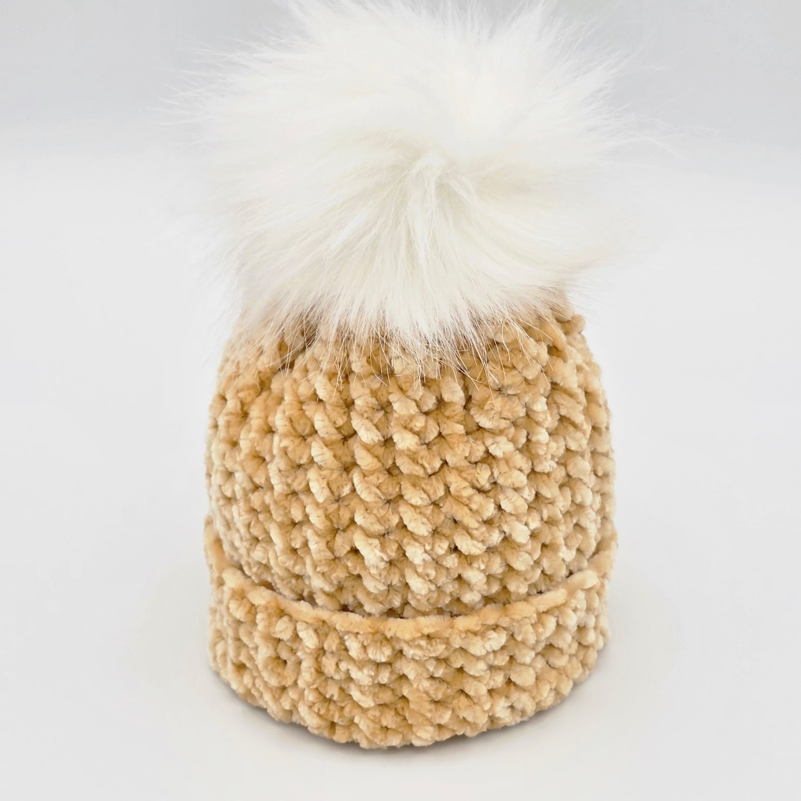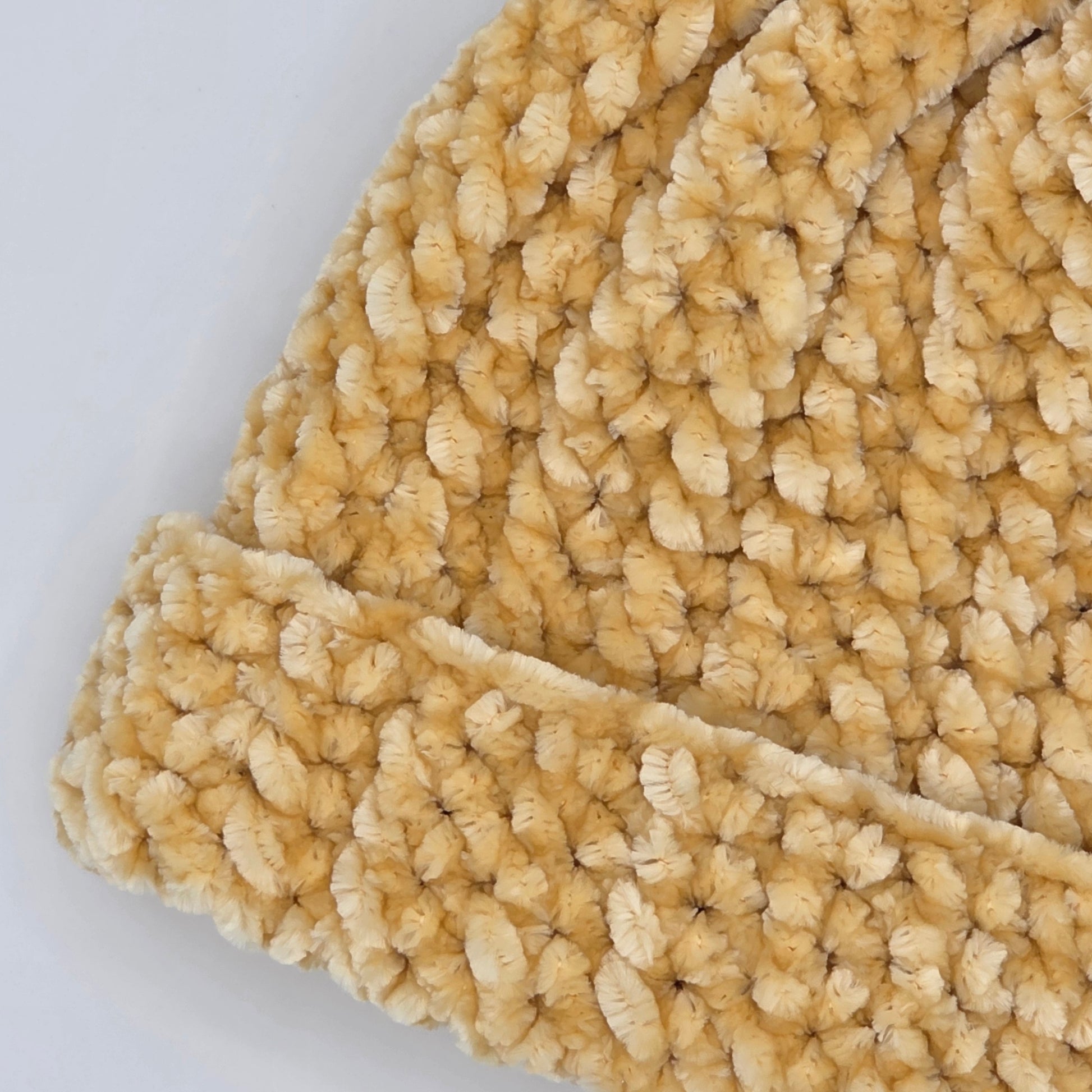 This little beanie feels like pure sunshine — soft golden velvet yarn paired with a fluffy faux-fur pom for the sweetest finish. It’s cozy, gentle on newborn skin, and hand-crocheted in small batches so each hat has its own charm. Perfect for newborn photos, baby-shower gifting, or keeping your little one snug on cool days.