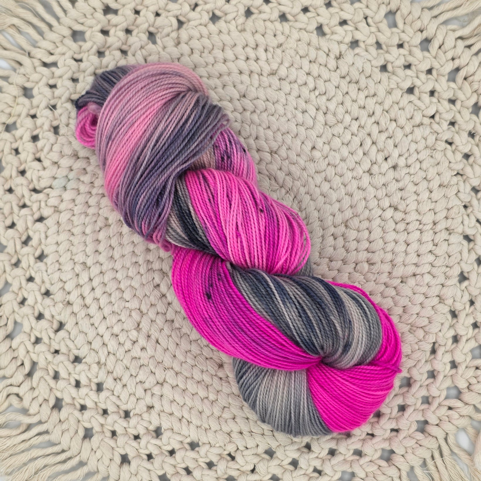 A playful pop of pink and gray with crisp, high-contrast variegation. Soft on the hands, smooth to knit, and dyed in small batches for subtle personality in every skein. Perfect for socks, hats, shawls, and bright, fun projects.