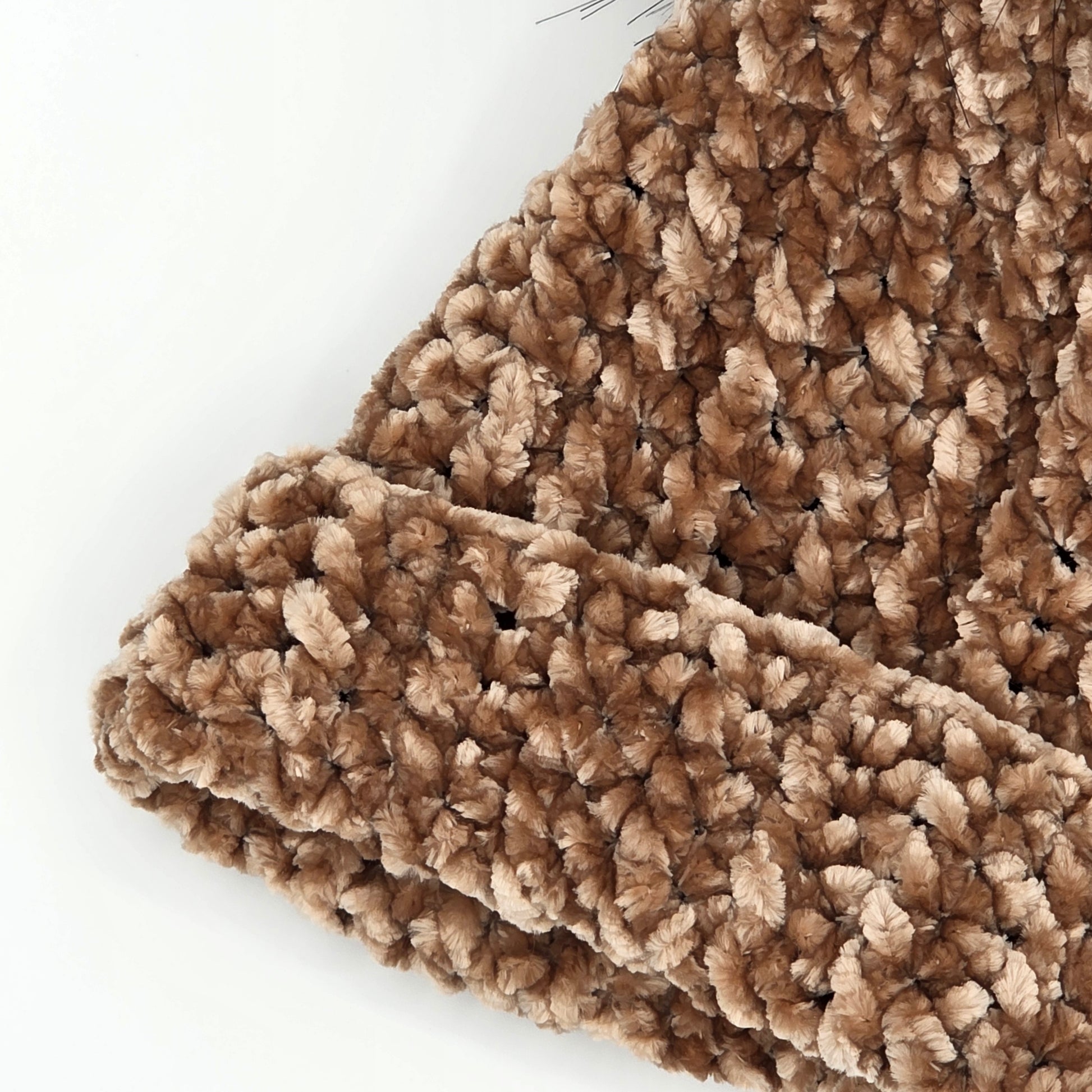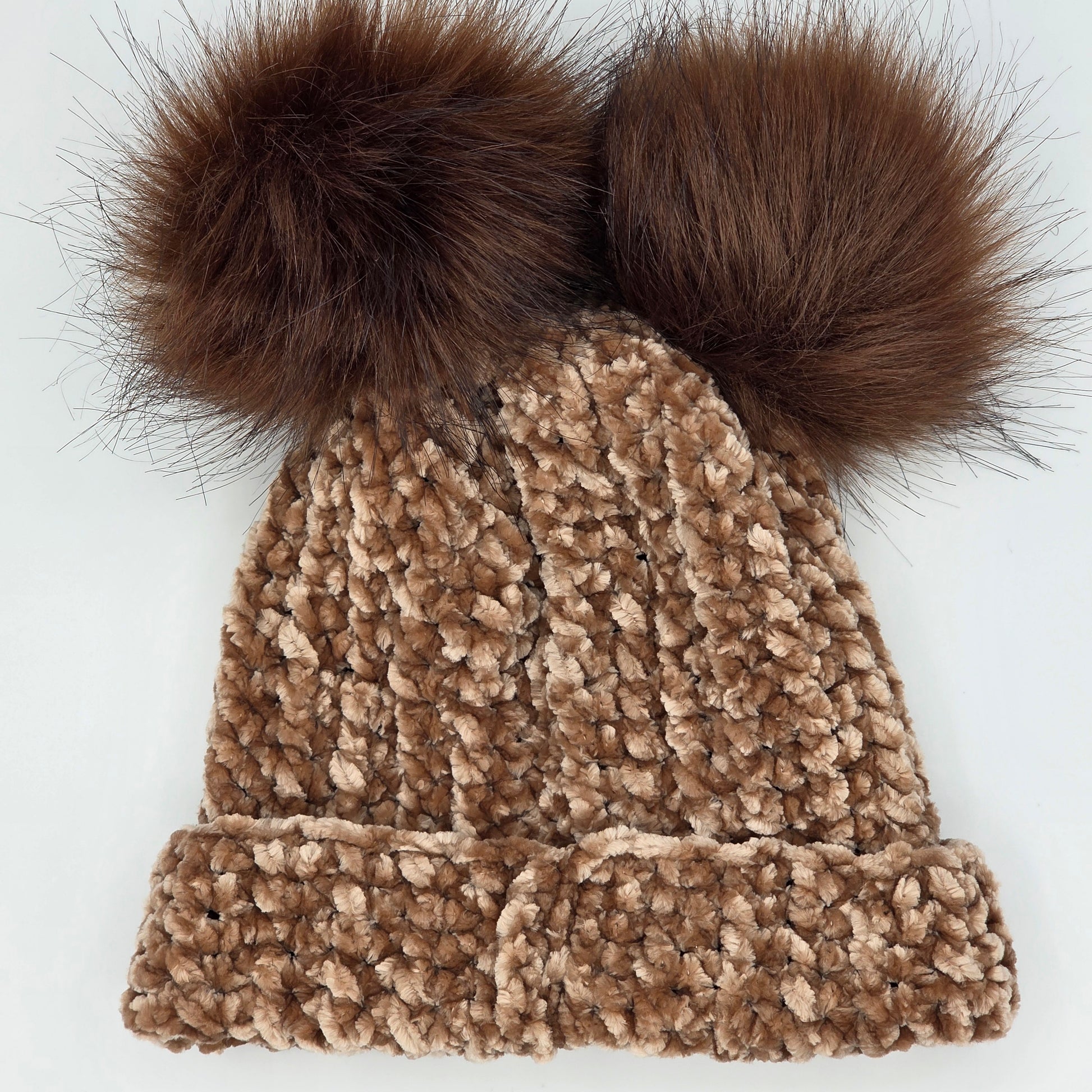 Soft, plush, and full of cozy charm — this mocha velvet beanie is hand-crocheted with thick, velvety yarn and topped with two dark faux-fur poms for the cutest finish. It’s gentle on newborn skin, warm for cool days, and perfect for newborn photos or a sweet baby-shower gift.